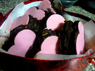 Stendere con il mattarello la pasta da zucchero rosa abbastanza sottile e ricavare 8 cuori, che andranno messi sulla superificie dei dolcetti, prima che il cioccolato si solidifichi. Far rassodare il cioccolato e conservare in frigorifero.